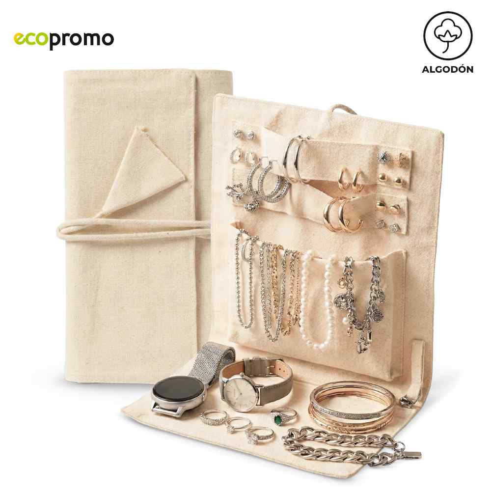 Joyero plegable en algodón. Incluye dos cintas para colgar objetos, un bolsillo sin cremallera y un bolsillo con cremallera. Incluye cordón para cerrarlo.