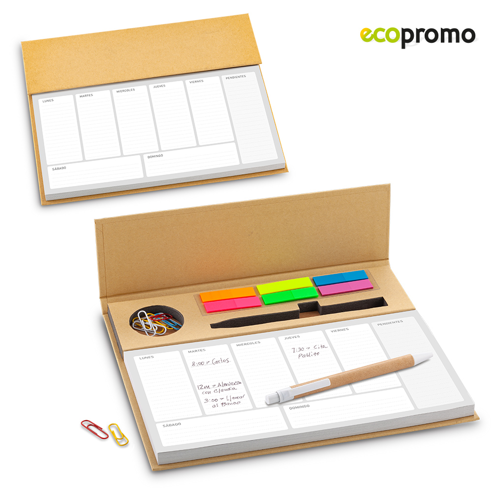 Planeador ecológico. Tapa dura con 100 hojas aprox. Incluye clips surtidos, bolígrafo y juego de 6 stickies de colores plásticos.