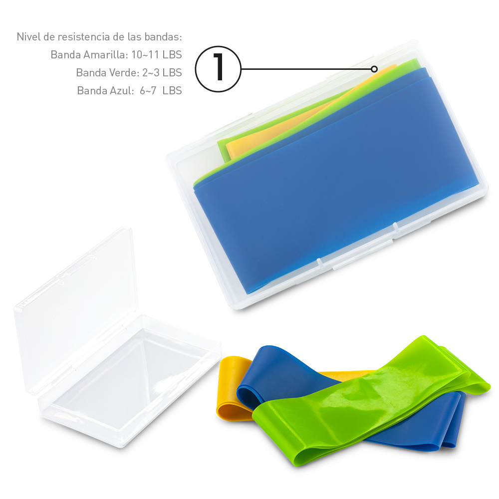 Set de tres bandas elásticas 100% TPE, cada una con un nivel de resistencia diferente. En estuche plástico.