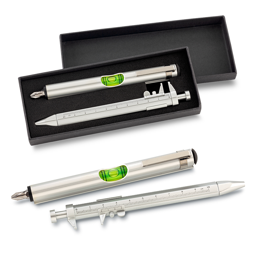 Set de bolígrafo plástico con regla, medidor de espesor y destornillador metálico con nivelador (2 de pala y 1 de estrella). Empaque caja individual.