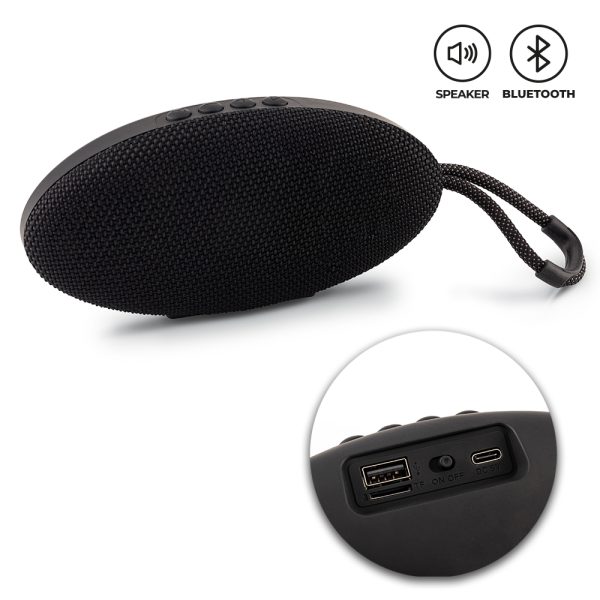 Speaker Bluetooth plástico recubierto en tela. Tiempo de reproducción: 3-4 horas.